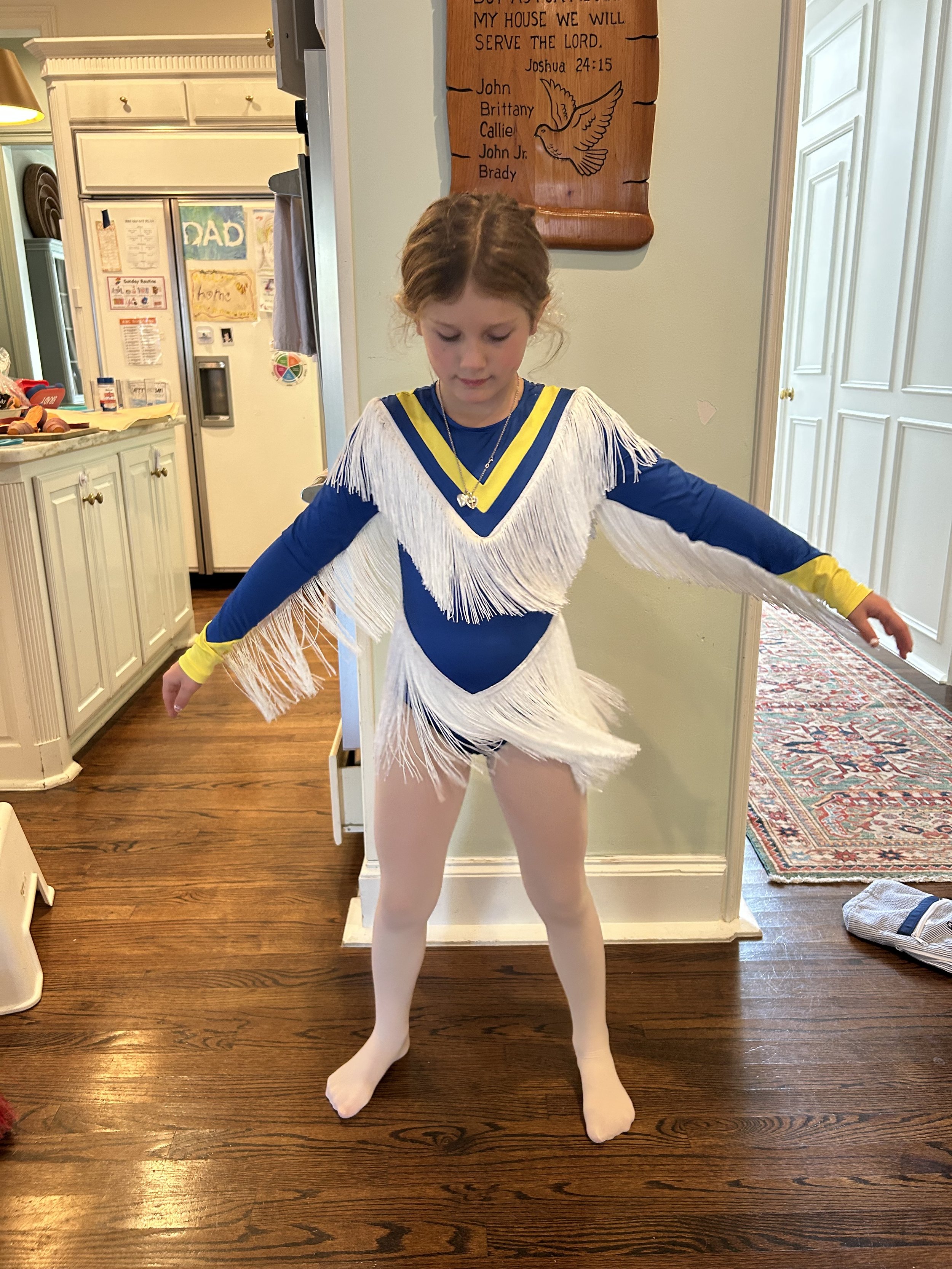 This darling outfit features layers of swingy fringe that cover the front and back beautifully, plus playful fringe accents on the arms and back for that signature sparkle and movement.